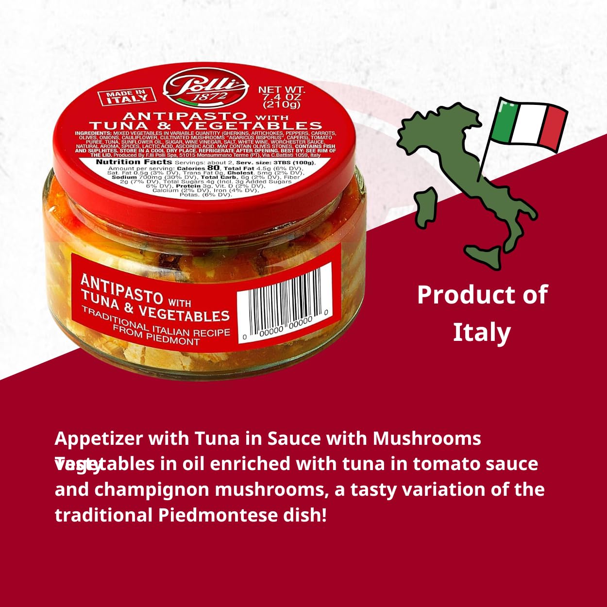 A1: The Polli Antipasto features a delightful combination of mixed vegetables, such as gherkins, artichokes, peppers, and olives, paired with tender yellowfin tuna in sunflower oil, all blended together with a rich tomato puree. It’s an authentic taste of Piedmont that’s ready to enjoy straight from the jar!