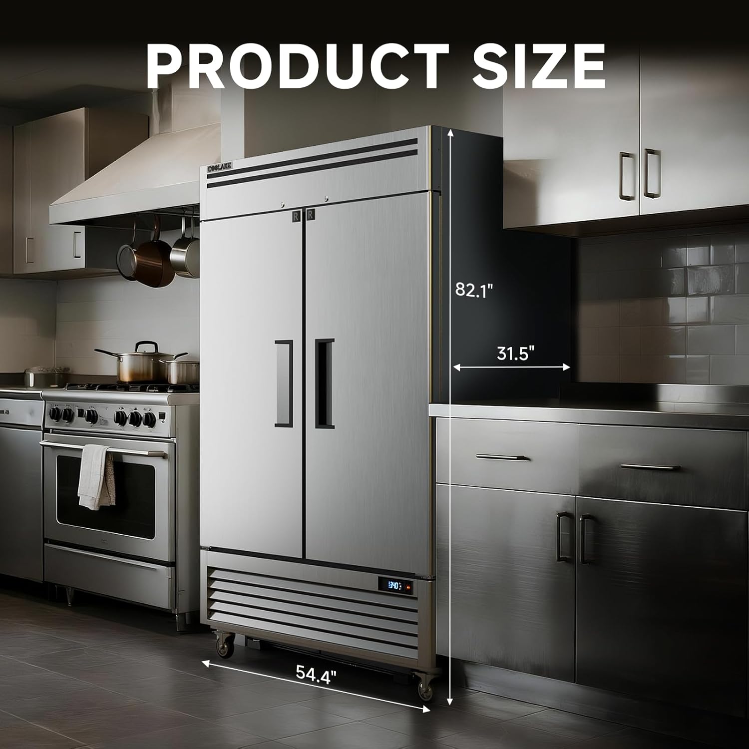 A: The Coolake Commercial Refrigerator has a width of 54.4 inches and offers an impressive 49 cubic feet of storage capacity. This spacious design makes it ideal for high-demand environments like restaurants or catering kitchens.