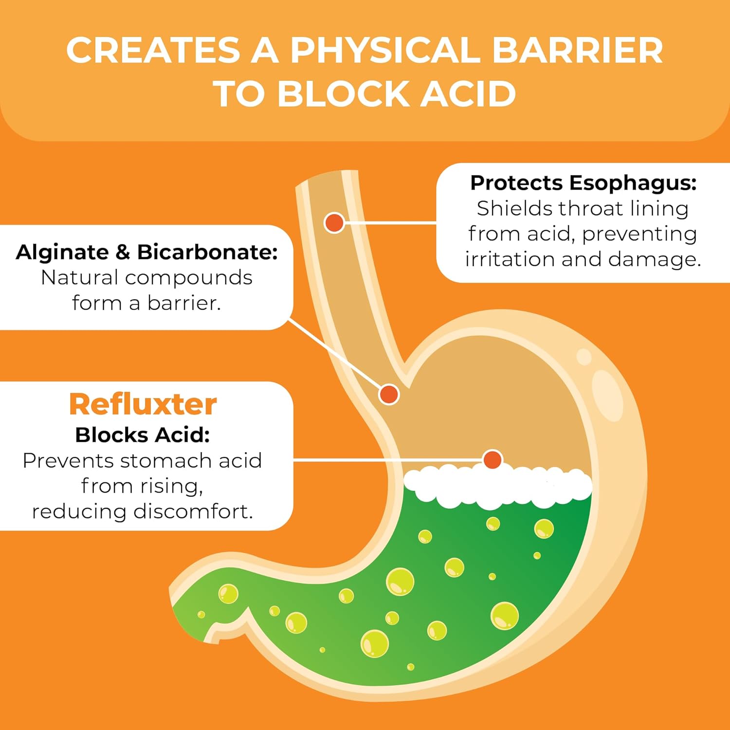A5: Refluxter contains a proprietary blend of sodium alginate, calcium carbonate, and sodium bicarbonate. Sodium alginate forms a gel-like barrier when it comes into contact with stomach acid, while calcium carbonate and sodium bicarbonate help neutralize acid, providing comprehensive relief from discomfort.