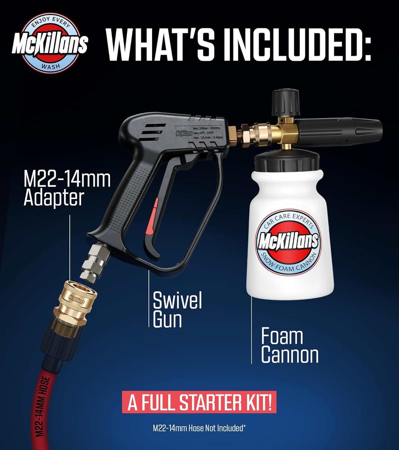 A: The McKillans Pressure Washer Gun kit comes as a complete starter set, including a swivel pressure washer gun, a foam cannon, and an M22-14mm adapter. This means you have everything you need to get started with your car washing experience right out of the box!